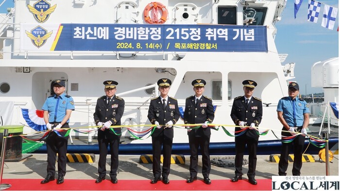[로컬세계 = 김명진 기자]전남 목포해양경찰서가 14일 목포해양경찰서 전용부두에서 최신예 경비정 ‘215정(200톤급/해우리 65)’의 취역식을 개최했다.