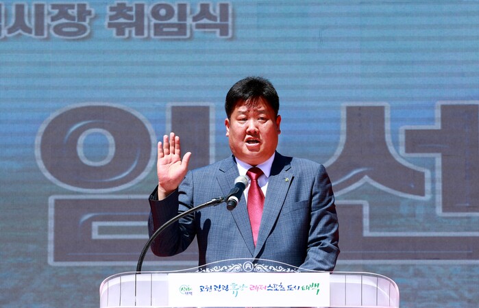 ▲이상호 태백시장이 취임선서를 하고 있다. 태백시 제공 |