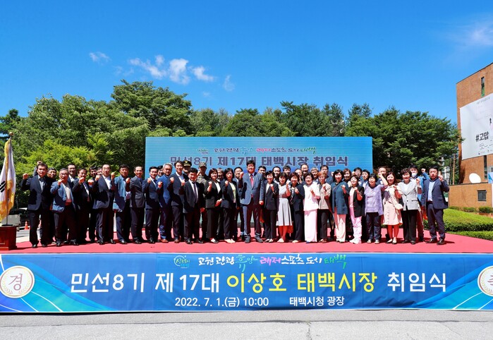 [로컬세계=박상진 기자] 민선8기 제17대 이상호 태백시장 취임식이 1일 오전 10시 시청 광장에서 고재창 태백시의회 의장을 비롯한 태백시의회 의원, 도의원, 유관기관 및 단체장, 출향단체회원, 시민 등이 참석한 가운데 개최됐다.