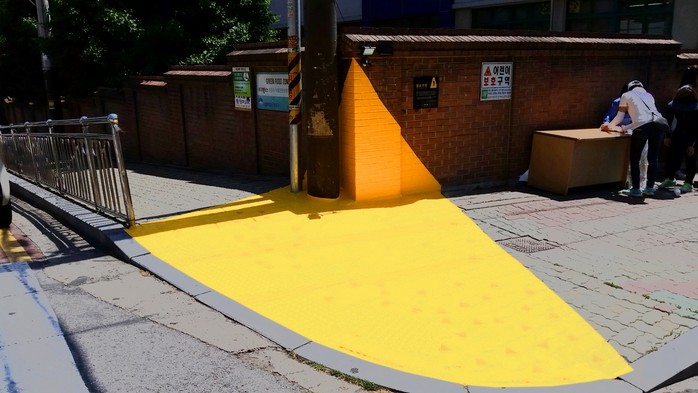 ‘옐로카펫’는 횡단보도 대기공간 바닥과 벽면에 눈에 띄는 노란색 노면표시를 해놓은 안전시설이다. 아이들은 안전한 곳에서 신호를 기다릴 수 있고 운전자는 보행하는 어린이를 잘 볼 수 있어 통학로 교통사고를 예방하는 장점이 있다.