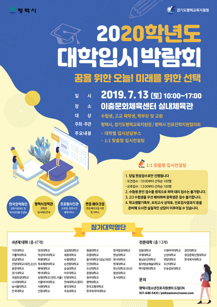 대학입시박람회는 이충체육문화센터에서 오전 10시부터 오후 5시까지 무료로 운영되고 각 대학교별 입학사정관의 입시상담과 1:1맞춤형 컨설팅 등으로 진행될 예정이다.