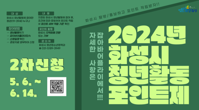 [로컬세계 = 임종환 기자]경기 화성시가 오는 14일까지 ‘2024년 청년활동포인트제’ 적립신청 2차 접수를 시작한다고 7일 밝혔다.