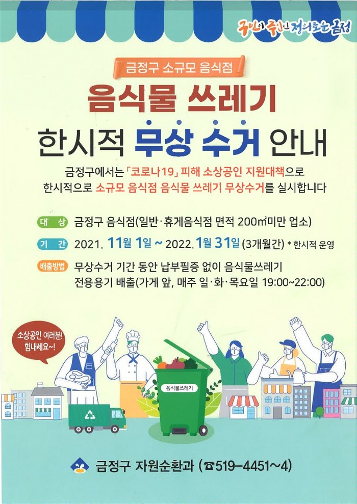 [로컬세계 맹화찬 기자]부산 금정구(구청장 정미영)는 코로나19 장기화로 경제적 어려움을 겪고 있는 소규모 음식점을 대상으로 1일부터 내년 1월 31일까지 3개월간 한시적으로 음식물쓰레기를 무상으로 수거한다고 밝혔다.