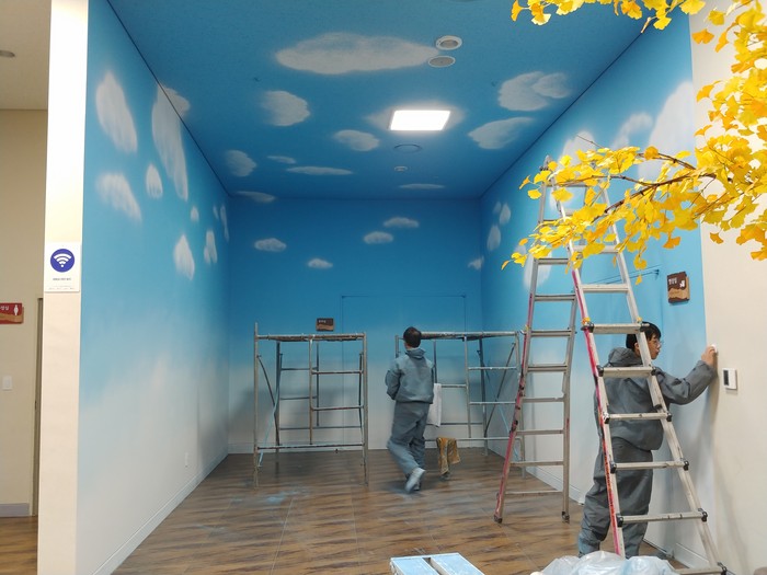 ‘클토리 공방’에서는 기존의 빈 벽면과 천장에 익룡과 하늘 그림으로 벽화를 그려 새로운 예술 공간이자 멋진 포토존으로 탄생시켰다.