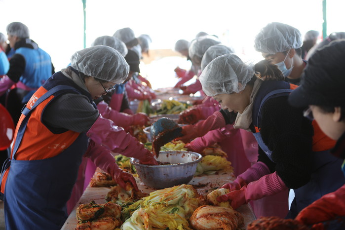 지역사회에서 꾸준히 나눔과 헌신의 봉사활동을 해오고 있는 군산시여성자원봉사회(회장 정연경)회원 50여 명과 군산시여성단체협의회, 호원대학교 스포츠단 씨름부봉사단, 세노야 봉사단, 세아베스틸 봉사단, 웰니스봉사단도 김치 담그기 행사에 참여해 온정의 마음을 더했다.