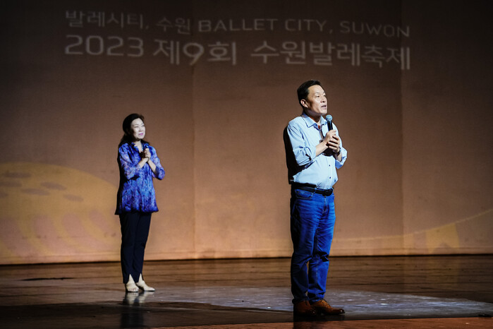 18일 저녁 수원제1야외음악당에서 시작된 ‘2023 수원발레축제’ 메인공연에 앞서 관객들에게 인사한 이재준 시장은 “그동안 수원발레축제가 성공적으로 치러지도록 노력해 주신 수원발레축제 총감독님과 발레단에게 감사드린다”며 “수원발레축제가 더 성장할 수 있도록 수원시의회, 발레인들과 힘을 모으겠다”고 말했다.