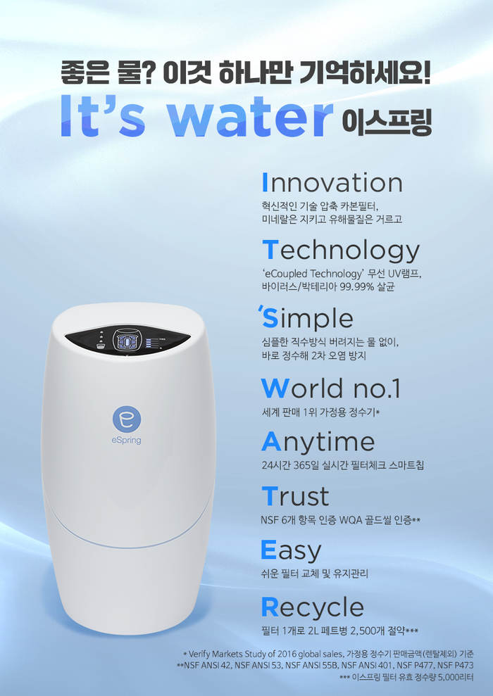 한편 이스프링 정수기는 ‘편리한 물’이 아닌 ‘좋은 물’을 만들고자 하는 브랜드 철학을 담아 세계적인 특허기술과 독자적인 기술로 세계 판매 1위 정수기를 개발했다. 24시간 365일 실시간 필터체크 스마트칩 내장은 물론 세계적인 특허 기술인 eCoupled 테크놀로지가 탑재된 무선 UV램프를 통해 마시기 직전의 살균으로 더욱 깨끗하고 건강한 좋은 물을 제공한다.