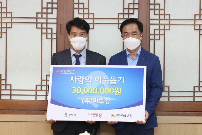 [로컬세계 김병민 기자]경기 평택시는 지난 27일 식품, 공산품 유통업체인 ㈜마트킹 대표 김희봉과 임원진이 시청 대외협력실을 에서 코로나19 4차 대유행으로 어려움을 겪고 있는 관내 취약계층에게 전달해 달라며 3000만원을 기탁했다고 30일 밝혔다.