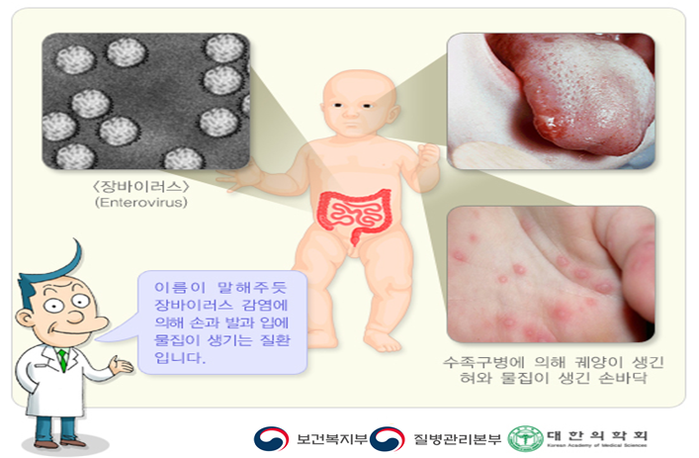 질병관리본부에 따르면 최근 수족구병은 왜래 환자 1000명당 15주차(4월 7~13) 2.5명으로 13주차 보다 0.7명 증가하고 있고 장 바이러스 감염으로 발열 및 입안에 물집과 궤양, 손과 발에 수포성 발진이 특징이라고 설명했다.
