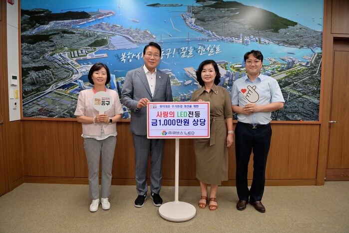 ▲부산 동구(구청장 김진홍 좌측,두번째 (주)큐브스 대표 조윤설 우측,두번째)는 LED등 지원.동구 제공 |