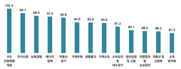 나머지 ‘주식시장’(99.7점), ‘남북경협’(98.0점), ‘에너지 정책’(97.5점), ‘부동산 경기’(96.8점), ‘소득양극화’(87.3) 등은 기준치를 밑돌았다.