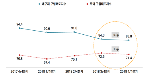 소비자태도지수의 구성요소인 현재생활형편지수와 미래생활형편지수도 3분기보다 각각 0.3 포인트, 2.7 포인트 하락해 87.4과 91.1을 기록했다. 이는 향후 경기불황, 가계소득 감소, 물가상승, 가계부채 증가 등의 이유로 1년 후 가구 생활형편이 악화될 것으로 보는 가구가 늘어났음을 의미한다.