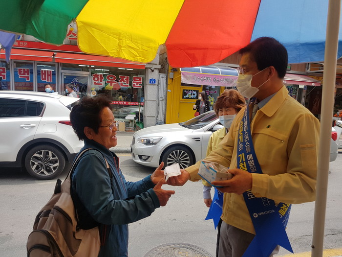 ▲류태호 태백시장이 지난 2일 시내 일원에서 한 시민에게 마스크를 배부하며 사회적 거리두기 실천을 독려하고 있다.(태백시 제공) |