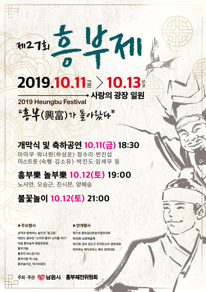 제27회 흥부제는 흥이 넘치는 공연, 다양한 체험거리, 풍성한 먹거리를 통해 대표 문화관광축제로 한층 더 새롭게 거듭나기 위해 변신중으로 이번 가을 가족과 함께 꼭 들러봐야 할 축제이다.