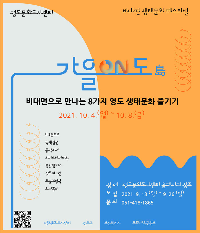 [로컬세계 맹화찬 기자]부산 영도문화도시센터(센터장 고윤정)는 오는 10월 4일부터 8일까지 5일간 영도구에 위치한 8명의 문화공간 운영자들과 함께 비대면 생태문화 페스티벌 '가을On도'를 추진한다.