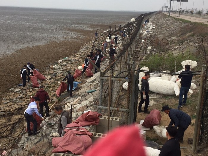 | ▲ 화성방조제에서 민·군·관 합동으로 진행된 해양환경정화 모습.(화성시 제공) |