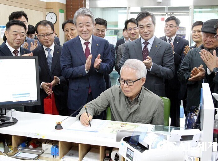 강호동 농협중앙회장이 ‘새출발 행복농촌 상생대출’ 1호 가입자 유찬상 조합원에게 축하 박수를 치고 있다. 농협 상호금융은 27일 ‘변화와 혁신을 통한 새로운 대한민국 농협’ 구현의 일환으로 농협중앙회가 2%p의 이자를 지원하는 '새출발 행복농촌 상생대출'을 출시했다.