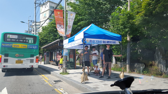 3일 시에 따르면 시민들의 왕래가 잦고 나무그늘이 없는 버스정류장 옆, 횡단보도, 교통섬 등을 중심으로 천막 형태의 그늘막 쉼터 40개소를 지난달 말 설치 완료했다고 밝혔다.