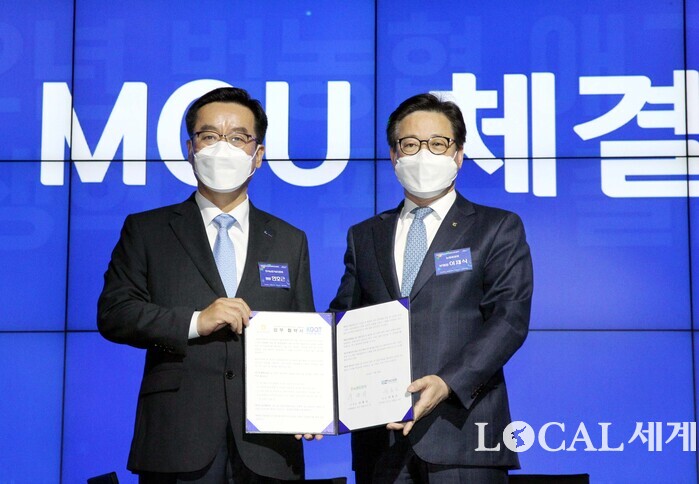▲ 농협은 디지털 농산업혁신기업을 육성·지원하기 위해 28일 서울 동대문 메리어트 호텔에서 애그테크 신사업 발굴·육성을 위한 농협중앙회-한국농업기술진흥원 간 업무협약 체결했다. 농협 이재식 부회장과(오른쪽) 조재호 농촌진흥청장(왼쪽)이 기념촬영을 하고 있다. |