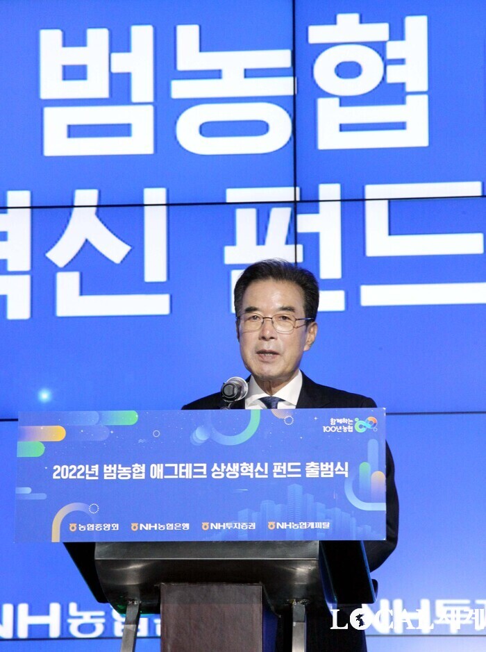 ▲ 농협은 디지털 농산업혁신기업을 육성·지원하기 위해 28일 서울 동대문 메리어트 호텔에서 ‘범농협 애그테크 상생혁신펀드’출범식을 개최했다. 이성희 농협중앙회장이 기념사를 하고 있다. |