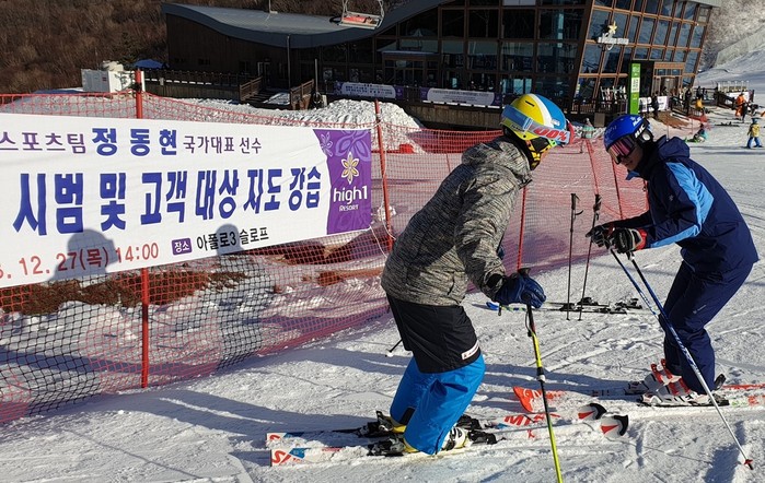 ▲스키장 고객들을 대상으로 강습회를 진행하고 있는 정동현 선수.(하이원스키장 제공) |