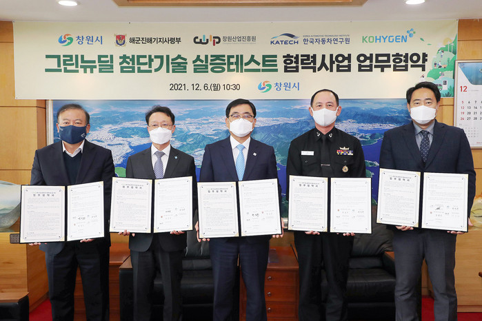 [로컬세계 권인진 기자]경남 창원시(시장 허성무)는 6일 오전 10시 30분 시청 접견실에서 해군진해기지사령부와 방위‧항만‧신재생에너지 분야 신산업 육성을 위한 ‘그린뉴딜 첨단기술 실증테스트 협력사업’ 업무협약을 체결했다.