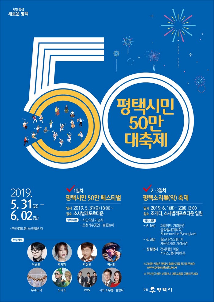 축제 첫날인 31일 오후 6시부터는 소사벌 레포츠타운에서 시민의 날 기념식과 함께 ‘평택시민 50만 페스티벌이 열린다.