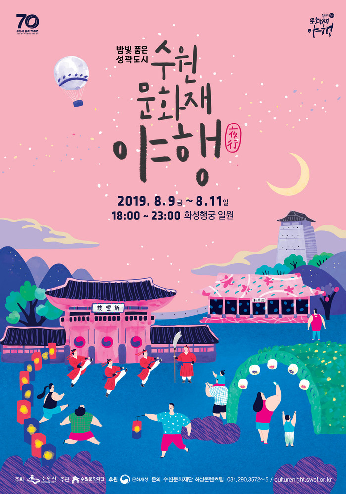 2017년 시작돼 올해 세 번째 열리는 ‘2019 수원 문화재야행’은 ‘밤빛 품은 성곽도시’를 주제로 화성행궁, 행궁광장, 행궁동 등에서 진행된다. 수원시가 주최하고, 수원문화재단이 주관한다.