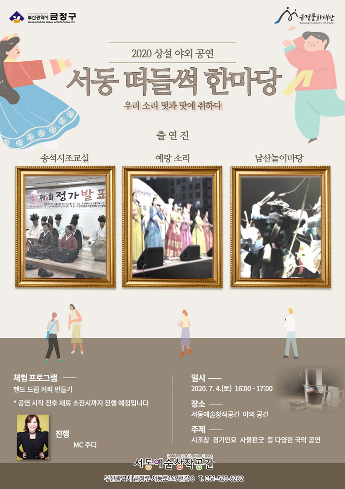 ‘2020 서동 떠들썩 한마당’ 중 처음으로 진행되는 ‘우리 소리 멋과 맛에 취하다’는 송석시조교실(시조창), 예랑소리(경기민요), 남산놀이마당(사물판굿)이 참여해 그동안 갈고닦은 솜씨를 뽐낸다. 국악공연 외에도 공연 전ㆍ후 현장에서 핸드드립 커피 만들기를 체험할 수 있다.