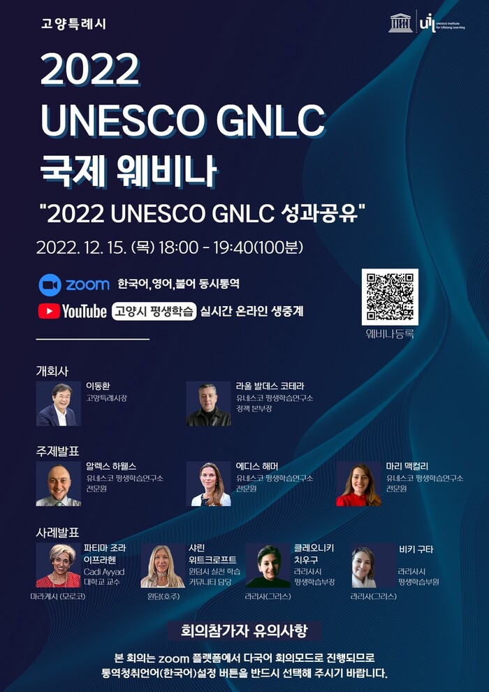 고양시와 유네스코 평생학습연구소(UIL)가 공동 주최하는 이번 웨비나는 UNESCO GNLC 회원도시 76개국 294개 도시가 참여하는 2022년 글로벌 학습도시 활동성과를 공유하고자 마련됐다.