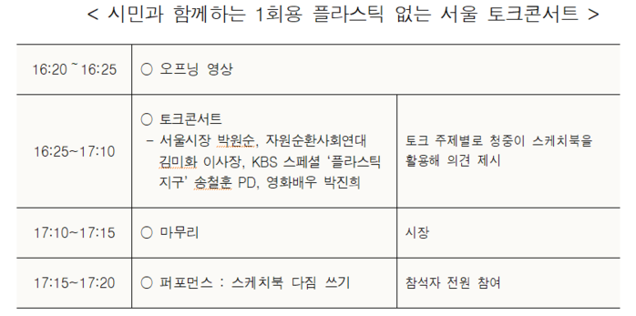 ▲시민과 함께하는 1회용 플라스틱 없는 서울 토크콘서트 주요 일정표.(서울시 제공) |