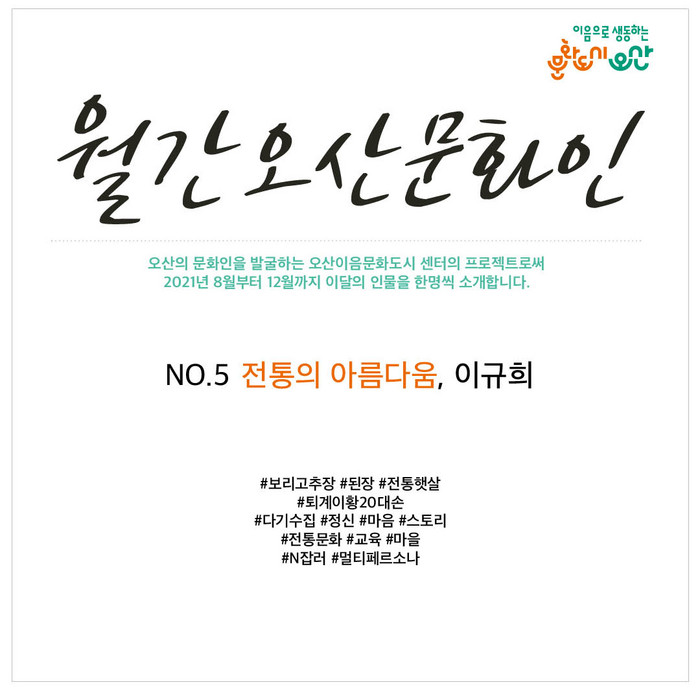 [로컬세계 김병민 기자]경기 오산시(시장 곽상욱) 이음문화도시센터(센터장 유종대)는 지역 문화인을 발굴하고 조명하는 ‘2021 월간 오산 문화인’ 다섯 번째 작가로 이규희 생활문화장인을 선정했다. 센터는 작가 영상을 공식 유튜브채널 ‘이음으로 생동하는 문화도시 오산’에서 공개했다.