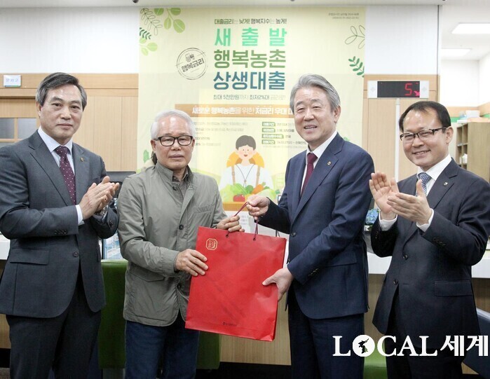 강호동 농협중앙회장(왼쪽 세 번째)이 27일 경기 서안성농협을 방문해 25년 동안 농협과 함께해 온 상생대출 1호 가입자 유찬상 조합원을 만나 감사의 마음을 전하며 ‘새출발 행복농촌 상생대출’가입행사를 가졌다. 강호동 회장이 유찬성 조합원에게 가입 선물을 전하고 있다. (왼쪽부터) 서안성농협 윤국한 조합장, 유찬상 조합원, 강호동 회장, 여영현 상호금융 대표이사.