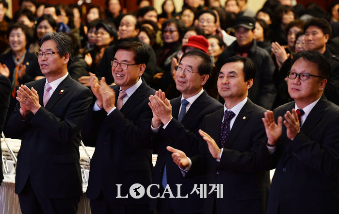 ▲ 2015 동대문구청 신년인사회에서 (좌측부터) 동대문구의회 의장직무대리 오세찬 부의장, 유덕열 동대문구청장, 박원순 서울시장, 안규백 국회의원, 민병두 국회의원 등이 참석해 축하의 자리를 같이 했다. © 로컬세계 |