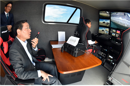 유정복 시장은 이날 DMS의 모니터에서 드론이 촬영해 실시간 전송한 영상을 보며 드론을 통해 불법 조업 중단을 지시하는 상황을 보여줬다.