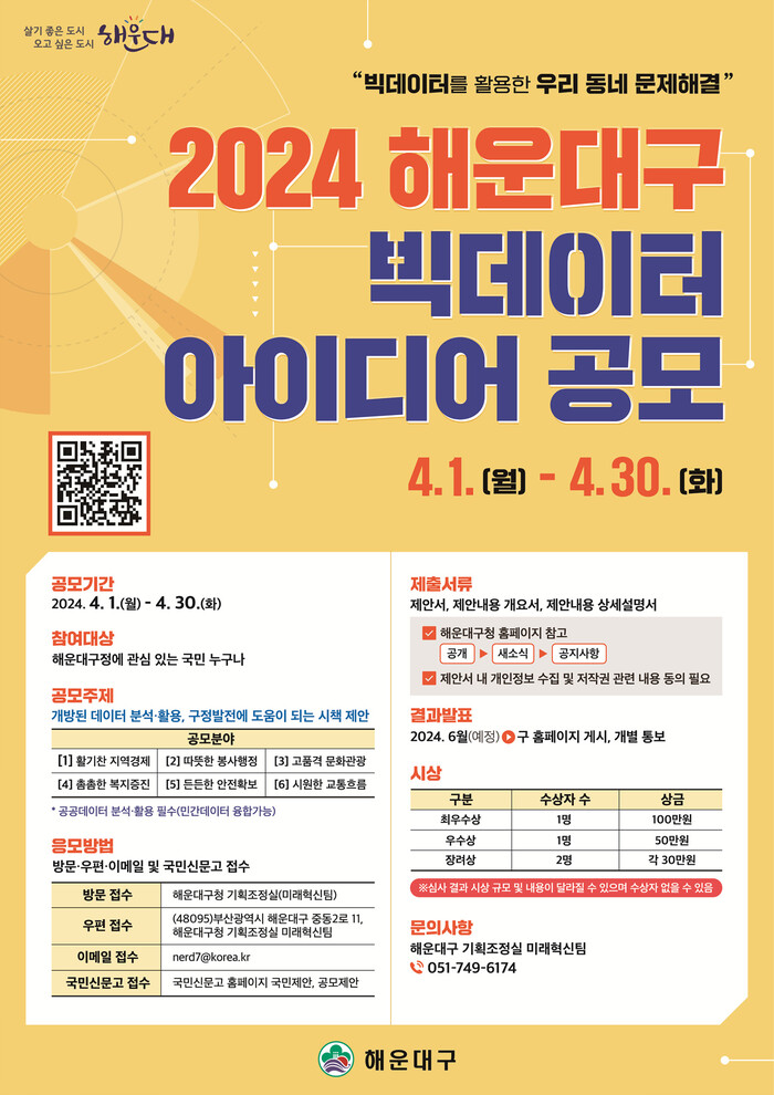 [로컬세계 부산=맹화찬 기자]부산 해운대구는 데이터에 기반한 실효성 있는 정책 추진을 위해 창의적 구정 발전 아이디어를 발굴하는 ‘2024 빅데이터 아이디어 공모전’을 실시한다.