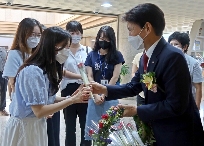 [로컬세계=박세환 기자] 대구 달서구(구청장 이태훈)는 1일 오전 10시 구청 2층 대강당에서 직원월례모임·취임식 전 참석 직원들에게 구화인 장미꽃을 전달하면서 직원들을 격려했다.