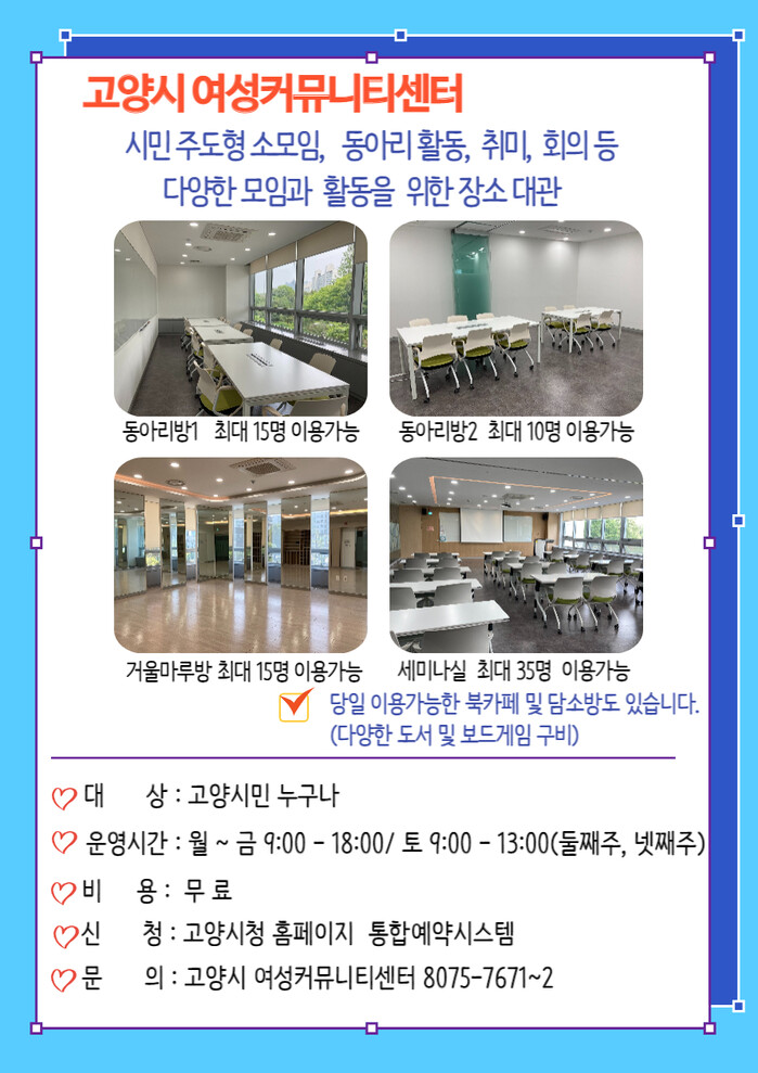 [로컬세계 = 이영원 기자]경기 고양특례시(시장 이동환)는 지역주민의 참여와 공동체 문화 활성화를 지원하는 공간으로 누구나 안심하고 소통할 수 있는 여성커뮤니티센터를 운영하고 있다고 11일 밝혔다.