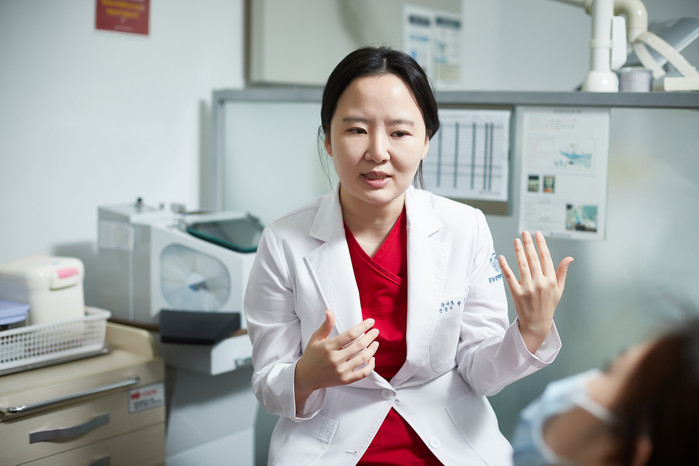 ▲강동경희대학교병원 구강내과 박혜지 교수가 한 여성 환자와 진료 상담하고 있다. |