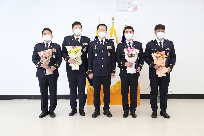 ▲중앙해양특수구조단의 김환경(총경, 가운데) 단장이 28일 단장실에서 승진 임용식을 한 뒤 대상자들과 기념촬영을 하고 있다. 코로나19 방역수칙을 감안해 승진 전체대상자 8명 중 4명만 참석했다. 중앙해양특수구조단 제공 |