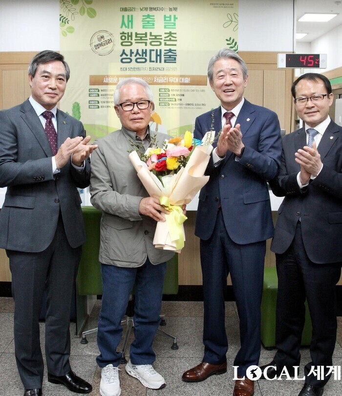 강호동 농협중앙회장(왼쪽 세 번째)이 27일 경기 서안성농협을 방문해 25년 동안 농협과 함께해 온 상생대출 1호 가입자 유찬상 조합원을 만나 감사의 마음을 전하며 '새출발 행복농촌 상생대출' 가입행사를 가졌다. (왼쪽부터) 서안성농협 윤국한 조합장, 유찬상 조합원, 강호동 회장, 여영현 상호금융 대표이사.