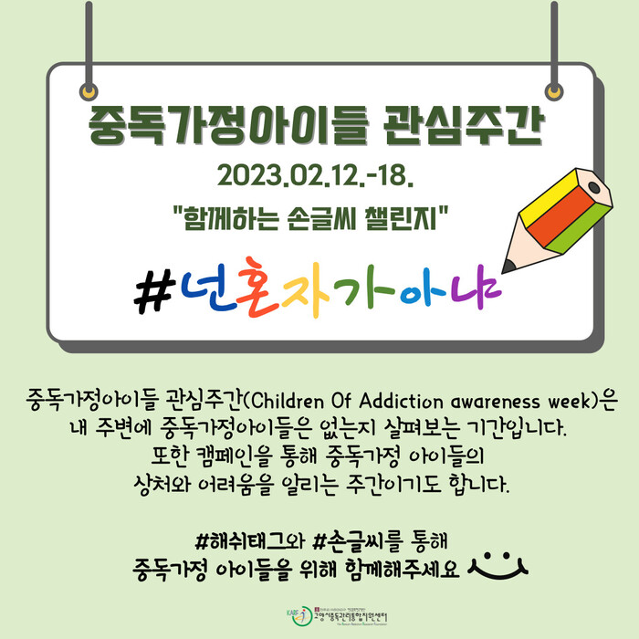 ‘중독가정아이들 관심주간’은 2023년 2월 12일부터 2월 18일이며, 해당 기간 동안 인스타그램에 본인이 작성한 #넌혼자가아냐 손글씨 게시물을 올림으로써 참여할 수 있다.