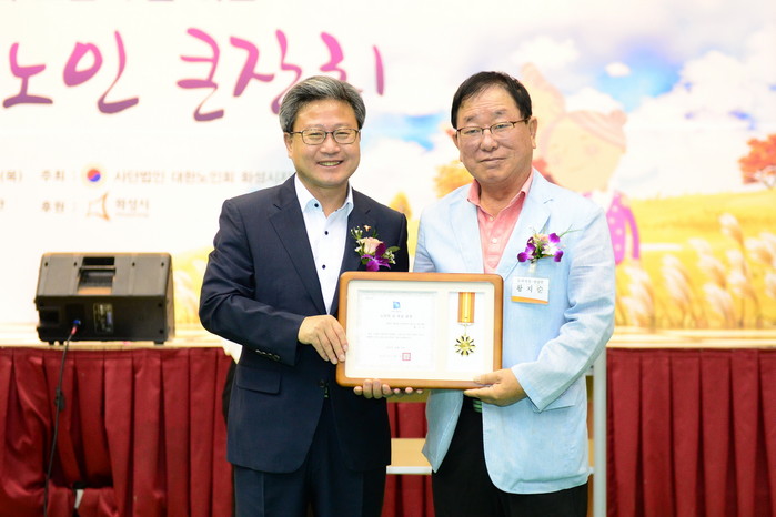 | ▲채인석 화성시장이 노인복지증진에 기여한 유공자에게 상을 수여하고 있다. |