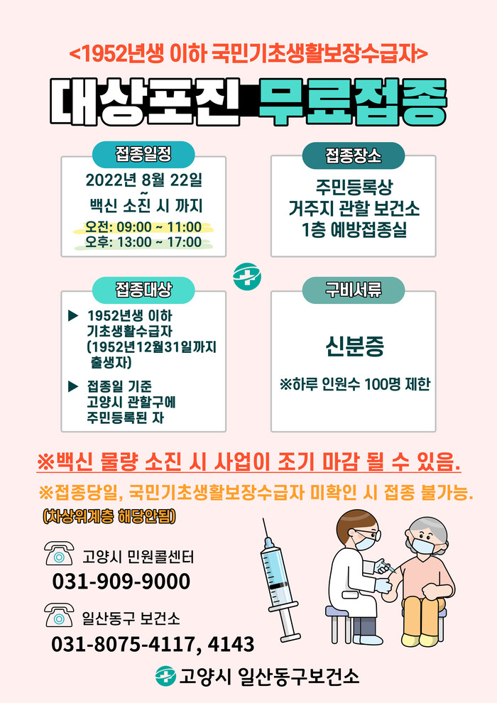고양시 관내 주민등록 주소지를 둔 만 70세 이상(1952년 12월 31일 이전 출생자) 기초생활수급자는 사전 예약 없이 신분증을 지참하여 등록주소지 관할 보건소를 방문하면 당일 접종받을 수 있다.