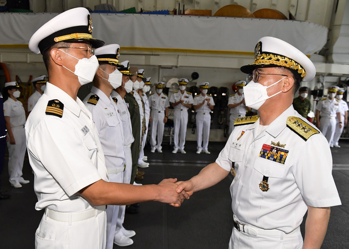| ▲이종호 해군작전사령관[오른쪽]이 3일 오전 왕건함 격납고에서 청해부대31진 장병들을 격려하고 있다.(해군작전사 제공) |