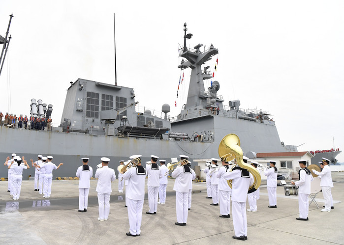 | ▲청해부대 31진 왕건함이 3일 오전 해군 군악대의 환영을 받으며 진해 군항에 입항하고 있다. |