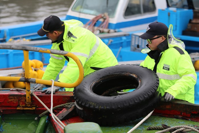 ▲군산해경 파출소 근무 경찰관이 선박의 이상유무를 살피고 있다. |