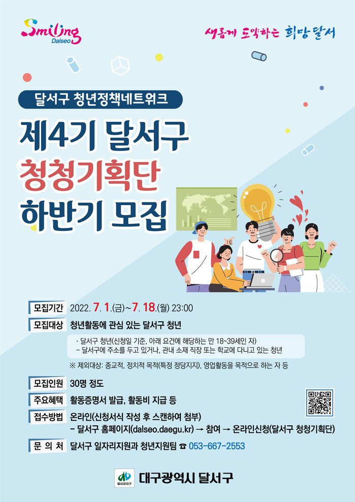 이태훈 달서구청장은 “지난 2년간 코로나19로 움츠러들었던 일상이 서서히 회복됨에 따라 청년들의 사회참여도 활발해지기를 기대한다. 청청기획단 모집에 달서구의 내일을 만들어가는 청년들의 많은 참여를 바란다”고 전했다.