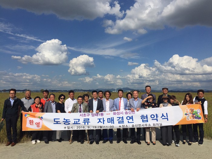 송산면사무소 회의실에서 열린 자매결연 협약식에는 최강우 송산면 주민자치위원장과 공주식 양재1동 주민자치위원장 등 양 지역 주민대표와 송산면장, 양재1동장 등 관계 공무원 40여명이 참석했다.