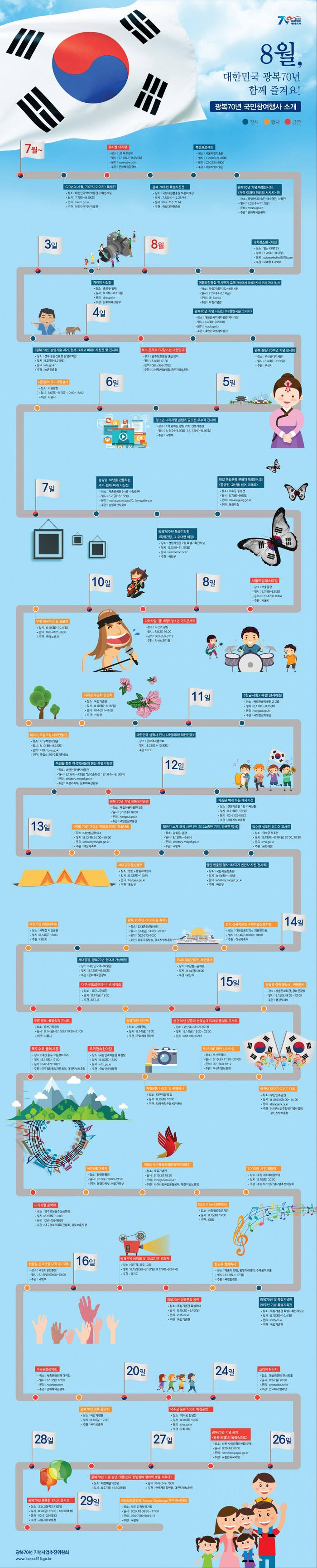 광복70년기념사업추위원회는 지자체와 정부 부처에서 진행하고 있는 주요 기념행사 65개를 인포그래픽으로 정리, 공식 홈페이지(korea815.go.kr)를 통해 배포하고 있다.